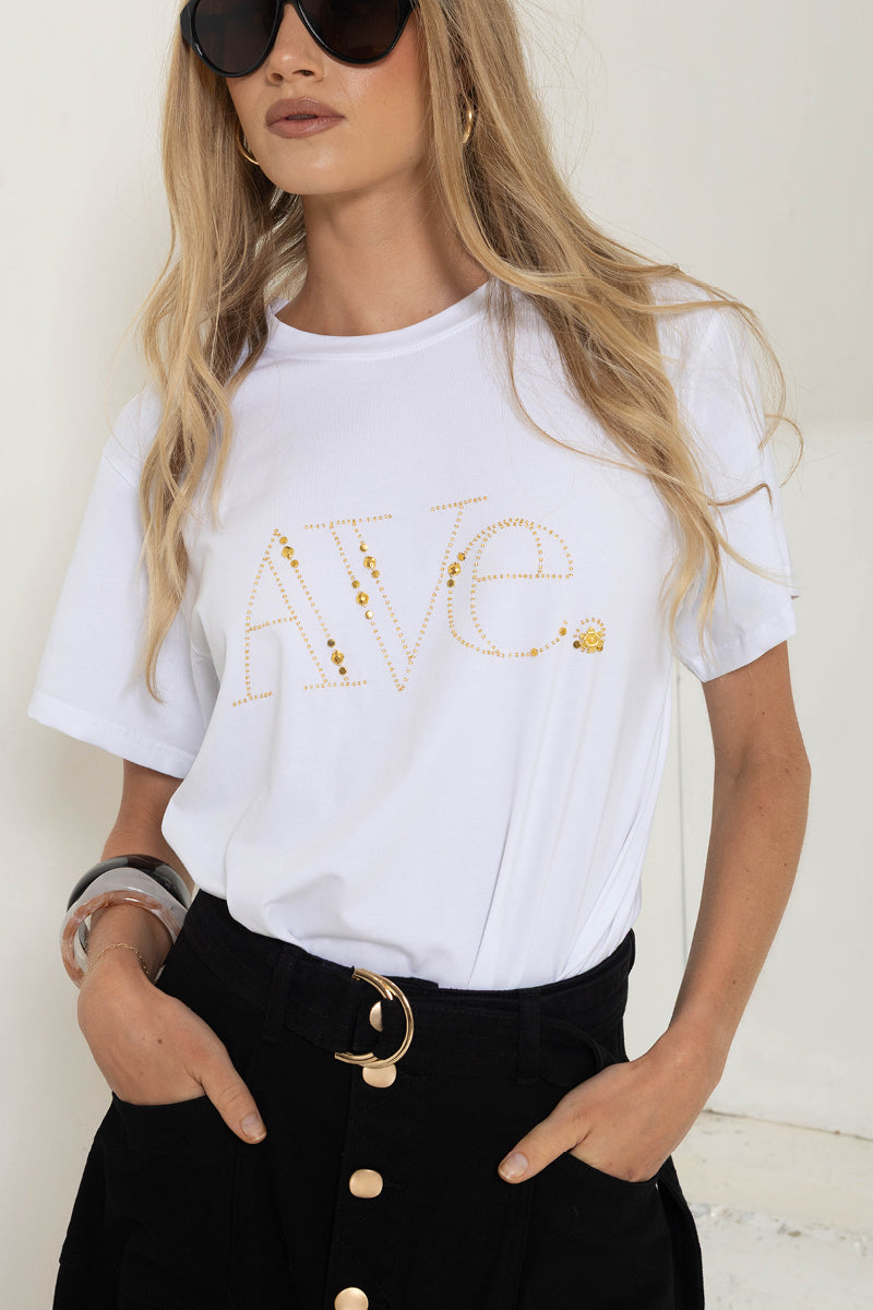 Crafted from ultra-soft premium cotton, this tee brings together everyday comfort with a statement finish. The hand-beaded gold AVE logo adds a subtle luxury touch, making it perfect for both casual wear and dressed-up moments.
